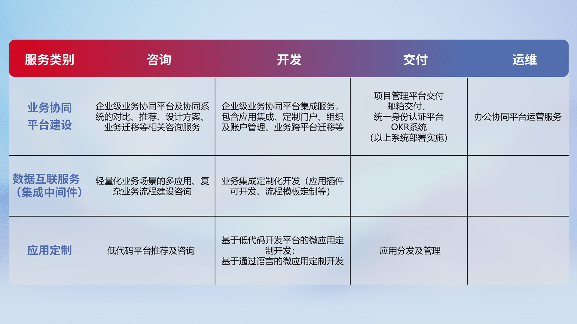 针对钉钉、、、企微、、、IDaas等平台级产品提供产品的规划、、、方案、、、交付、、、、定制化开发等服务,,,实现如统一协同办公、、、、智能客户服务、、混合会议管理、、智能数据查询、、等业务场景,,,,实现数字化转型。。
