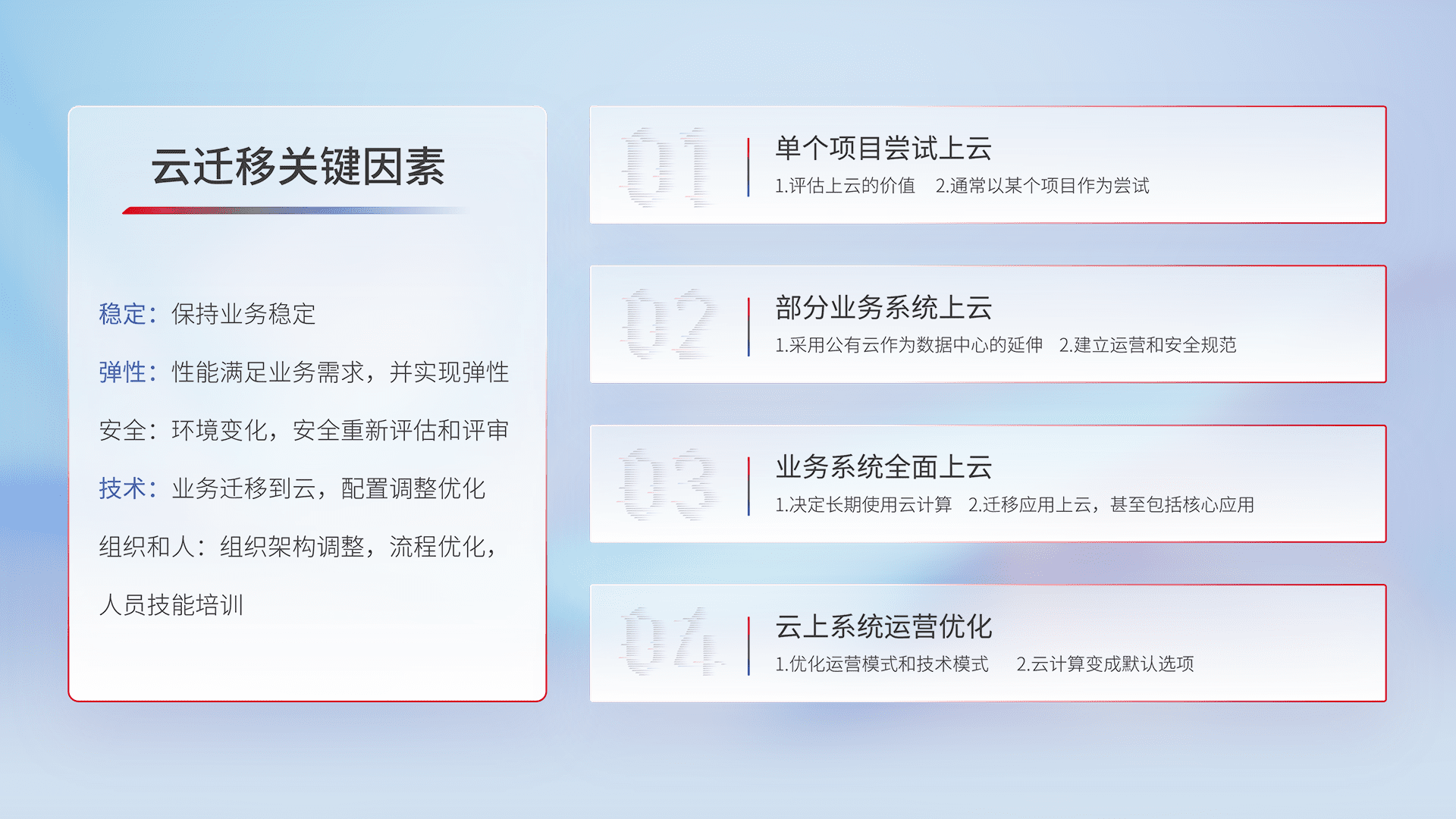 结合实际业务,,,,从规划设计、、、、云平台选型、、、云原生改造、、数据迁移、、、集成交付,,迁移全过程为客户识别最佳上云路径,,,,做好风险识别管理,,,,设计网络架构、、、身份权限、、安全审计合规、、操作审计、、、日志审计、、、监控告警策略、、、多站点容灾设计等,,对云上基础设施进行整体规划,,提升IT治理水平,,以满足弹性、、、、高可用、、、、高性能的需求。。。