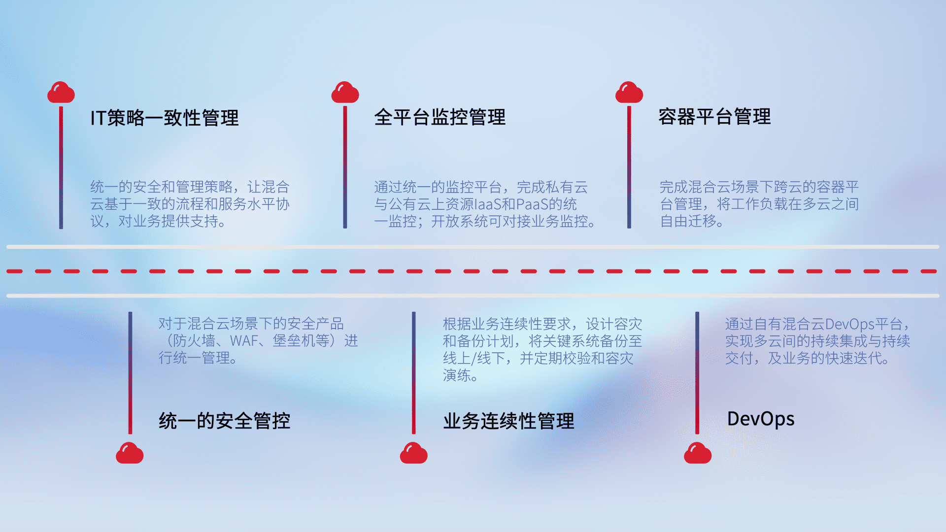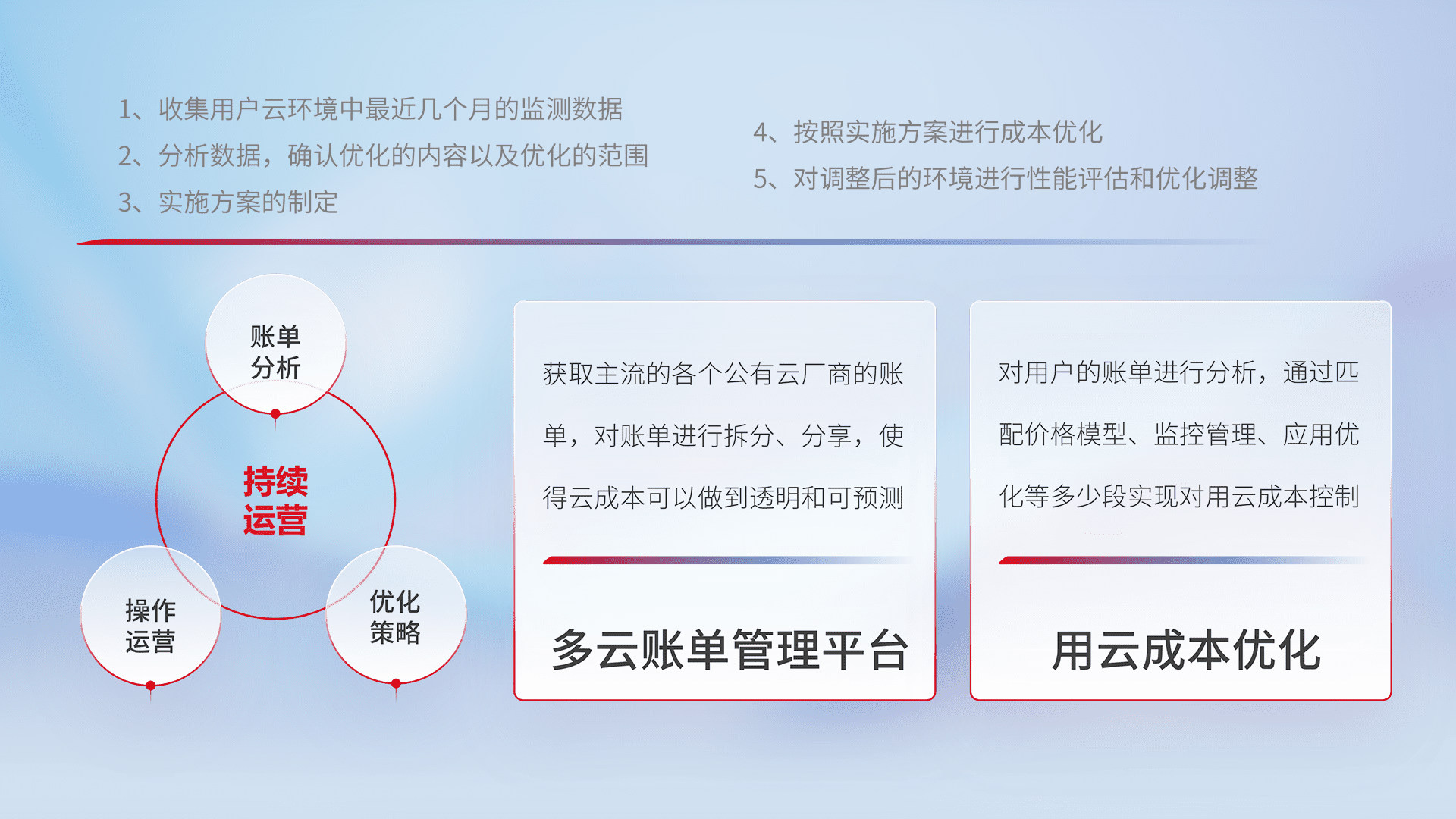 通过多云纳管,,,以统一的资源数据模型把客户的云资源进行抽象和封装,,进而实现对多云资源的统一操作,,,,保障云资源管理的可靠性、、稳定性与可用性。。量身定制化运维内容,,,,配置、、开发运维、、、、补丁管理、、备份、、、监控、、、认证和访问管理、、、、审计和日常巡检等,,保障在用云过程中的可靠度,,,稳定度以及高可用率。。。
